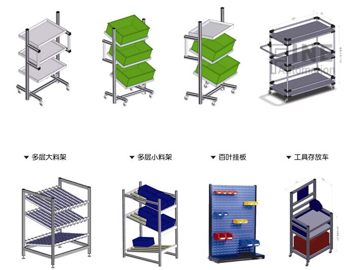 物料周轉(zhuǎn)車采用鋁合金型材或線棒組合而成,也可采用鋼結(jié)構(gòu)焊接而成,根據(jù)物料的重量和尺寸、形狀以及生產(chǎn)節(jié)拍等因素,可設計成一層或多層結(jié)構(gòu),每層的底板可以采用密度板、實木板或鋼板結(jié)構(gòu)。根據(jù)需要,每層可設計成符合人機工程學的傾角設計;物料車底部配有腳輪(可帶剎車)。形式結(jié)構(gòu)多樣,外觀美觀大方,實用性強。